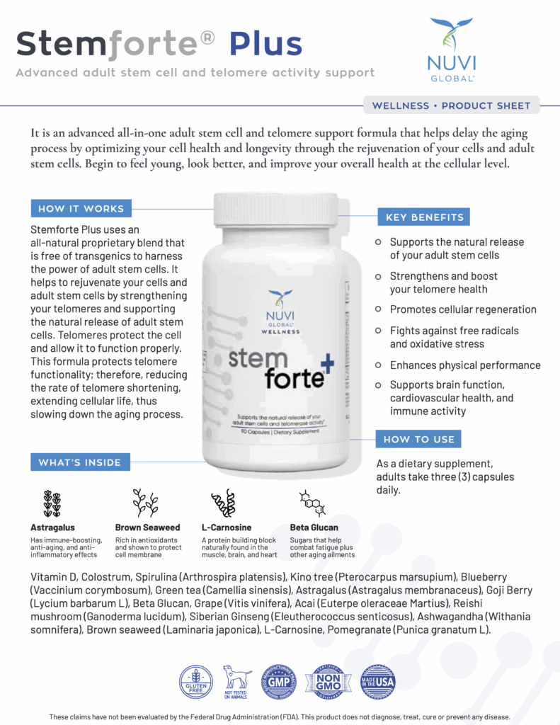 Stemforte Plus® is an advanced all-in-one adult stem cell and telomere support formula that helps delay the aging process by optimizing your cell health and longevity through the rejuvenation of your cells and adult stem cells.